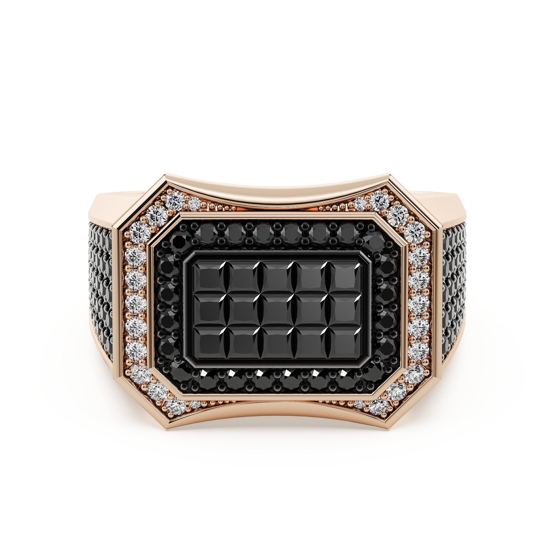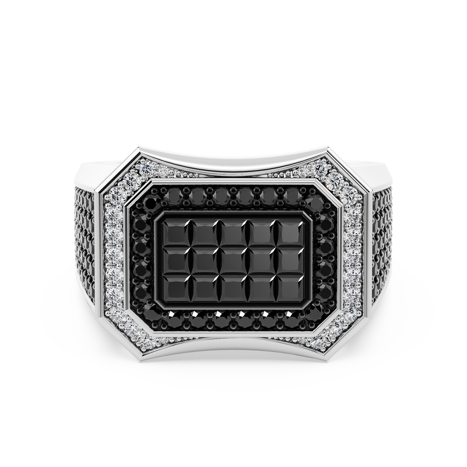 A precise perimeter of brilliant white diamonds frames the central block, creating a sharp, structural contrast against the hand-polished ring that allows the center stones to appear as a single, liquid surface of shadow.