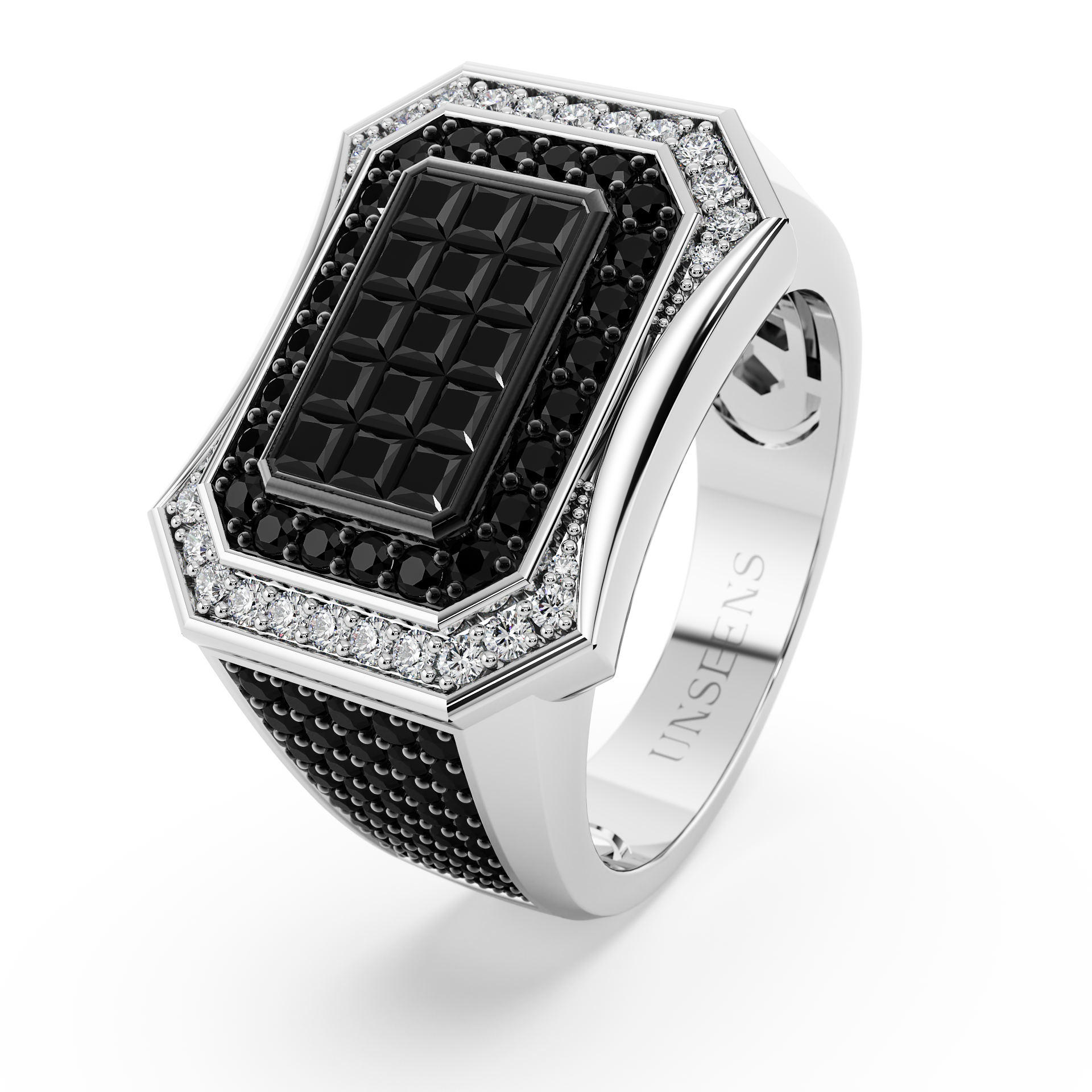 Part of our commitment to the "unseens" artistry of the master jeweler. The Monolith is more than a ring, it is a symbol for the self-sovereign man. This piece is a study in high-jewelry technicality and masculine power. At its heart lies a seamless matrix of black diamonds, meticulously secured via a master-grade invisible setting, a pinnacle of high-jewelry artistry where the metal disappears, leaving only the deep, nocturnal fire of black diamonds.